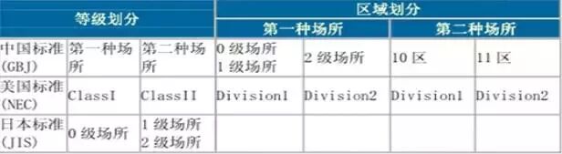 1)在爆炸性气体区域(0区、1区、2区)不同电气设备使用安全级别的划分。如旋转电机选型分为隔爆型(代号d)、正压型(p)、增安型(e)、无火花型(n)