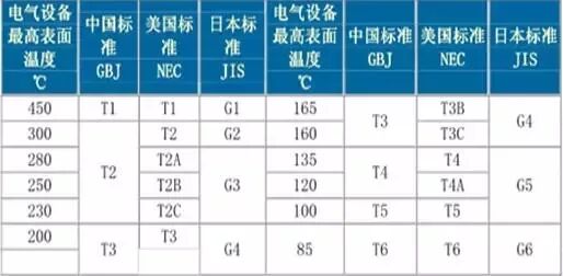 3)引燃某种介质的温度分组的划分。主要分为T1-450℃<T、T2-300<T≤ 450℃、T3-200<T≤300℃、T4-135<T≤200℃、T5-100<T≤135 、T6-85<T≤100℃。